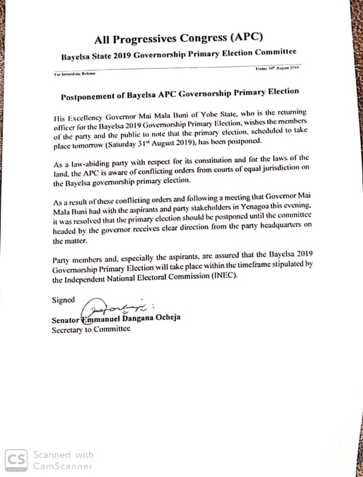 “In deference to a court order, the National Working Committee of the All Progressives Congress has shifted the date for the Bayelsa governorship primary till Tuesday and Wednesday, September 3 and 4, 2019,” the statement said.