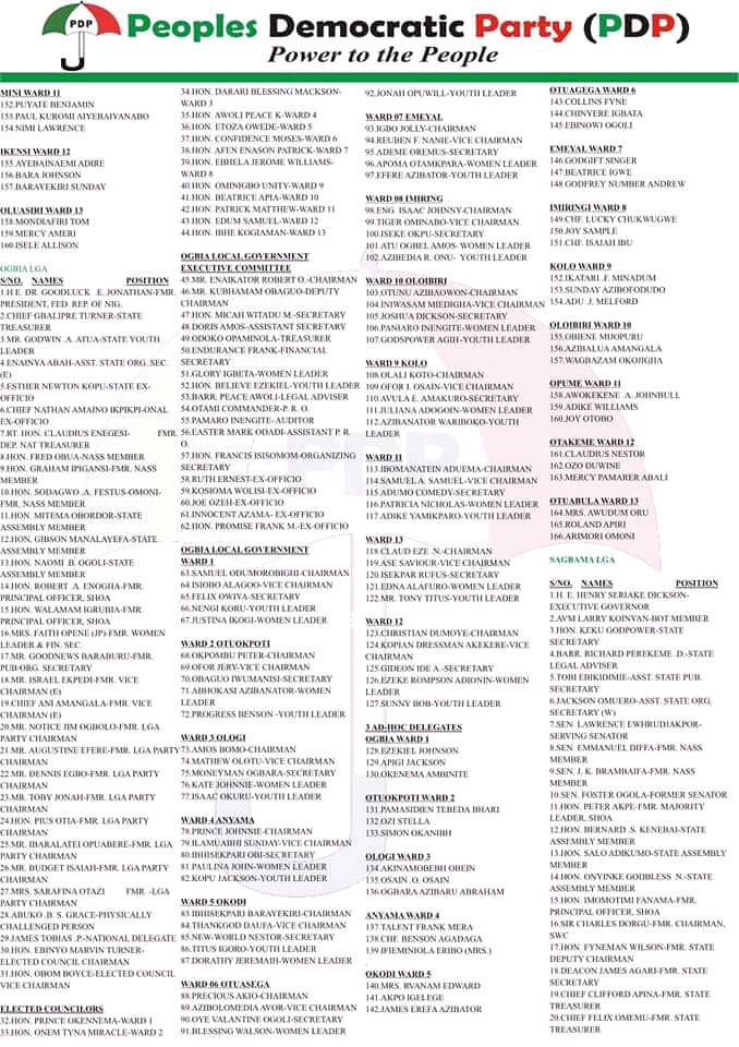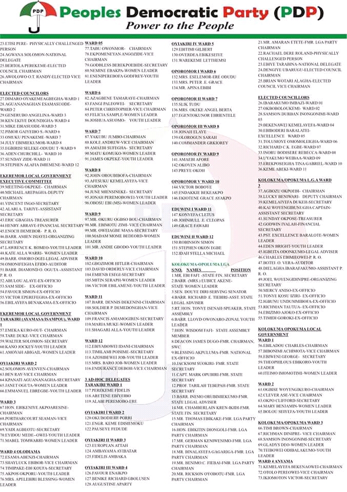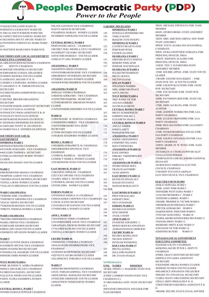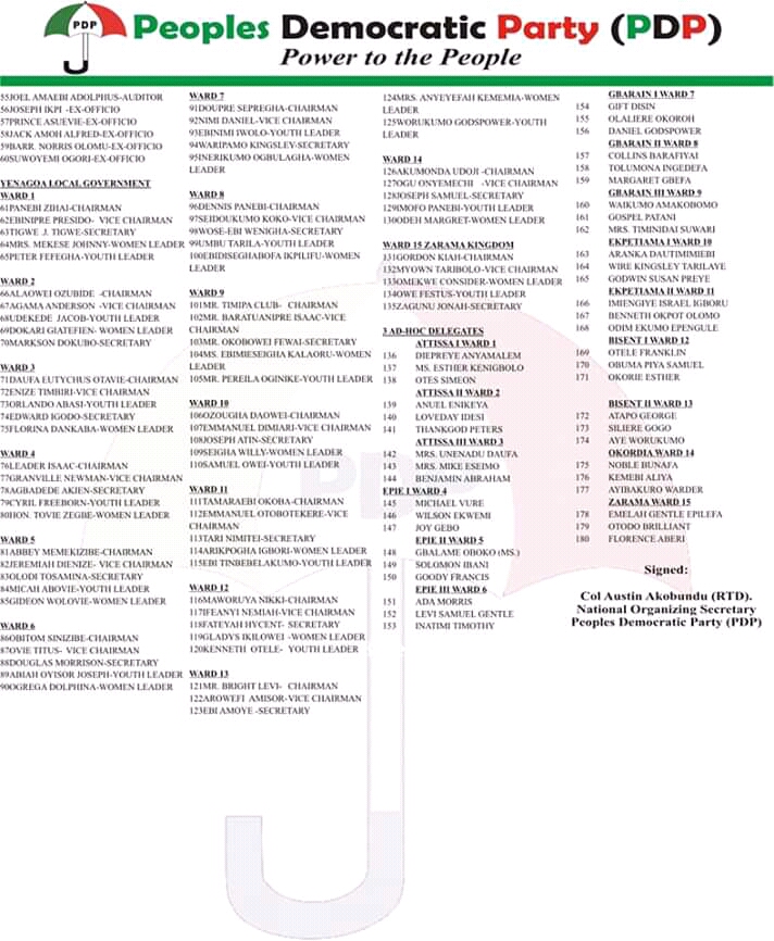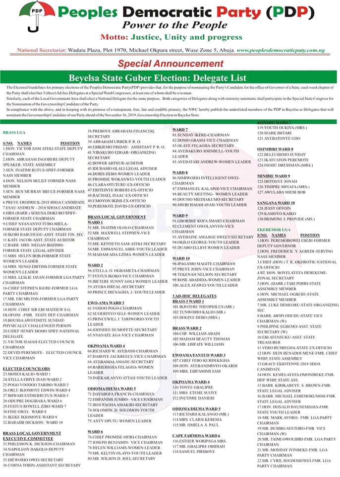 In compliance with the above, and in keeping with its promise of a transparent, free, fair and credible primary, the NWC hereby publish the underlisted members of the PDP in Bayelsa as Delegates that will nominate the Governorship Candidate of our Party ahead of the November 16, 2019, Governorship Election in Bayelsa State.
