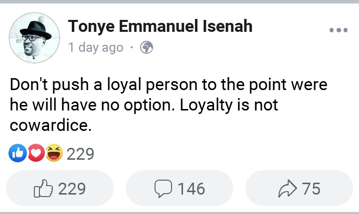 The post which had 146 comments and 75 shares as the time filing this report reads: “Don’t push a loyal person to the point were he will have no option. Loyalty is not cowardice.”