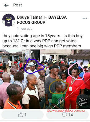 A facebook user has alleged that there was underage voting in Opume ward 11 unit 1 of the Ogbia Local Government Area, the same unit which the Bayelsa State Commissioner for Information and Orientation Hon. Daniel Iworiso-Markson casted his ballot.